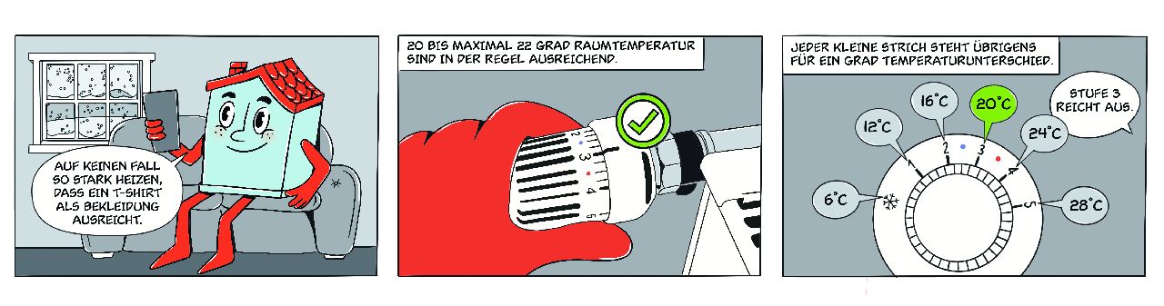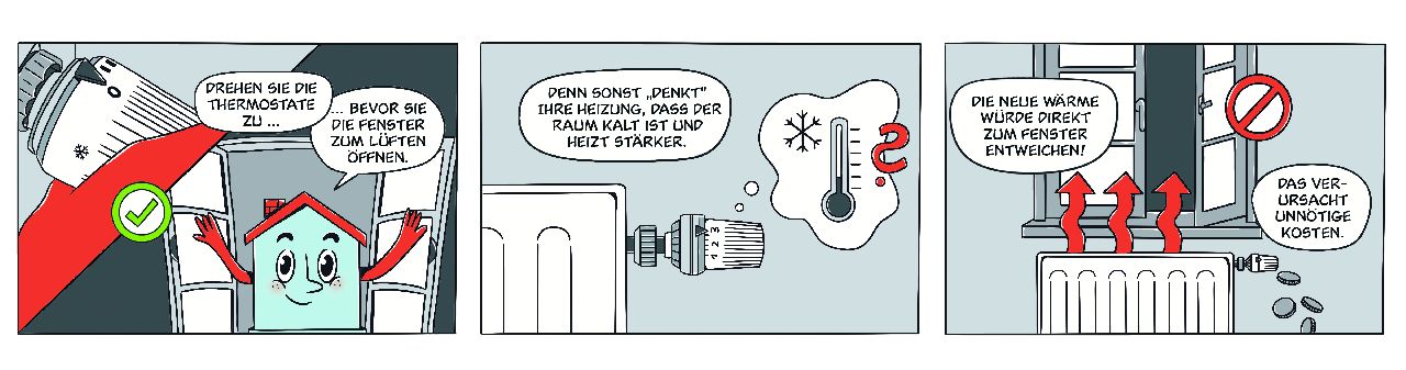 Drehen Sie Ihre Thermostatventile zu, wenn Sie die Fenster zum Lüften öffnen. Ansonsten „denkt“ Ihre Heizung, dass der Raum kalt ist und stärker beheizt werden muss. Die Heizung wird dann bei offenem Fenster heißer und heizt zum Fenster hinaus. Die Energiekosten werden so unnötig hoch.