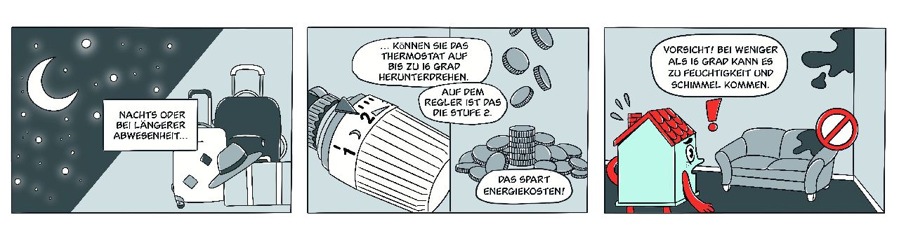 Sie sparen Energie, wenn Sie die Raumtemperatur nachts oder bei längerer Abwesenheit verringern. Es sollte jedoch eine Mindesttemperatur von 16 - 17 °C beibehalten werden, da es sonst leichter zu Feuchteschäden und zu Schimmelbildung kommen kann.