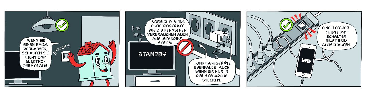 Lassen Sie Fernseher und andere Elektrogeräte nach der Nutzung nicht im Standby-Modus, sondern schalten Sie sie ganz aus. Ladegeräte können übrigens auch dann Strom verbrauchen, wenn sie nur in der Steckdose stecken, aber kein Gerät angeschlossen ist. Am einfachsten sind Steckerleisten, die über einen Ausschalter verfügen.